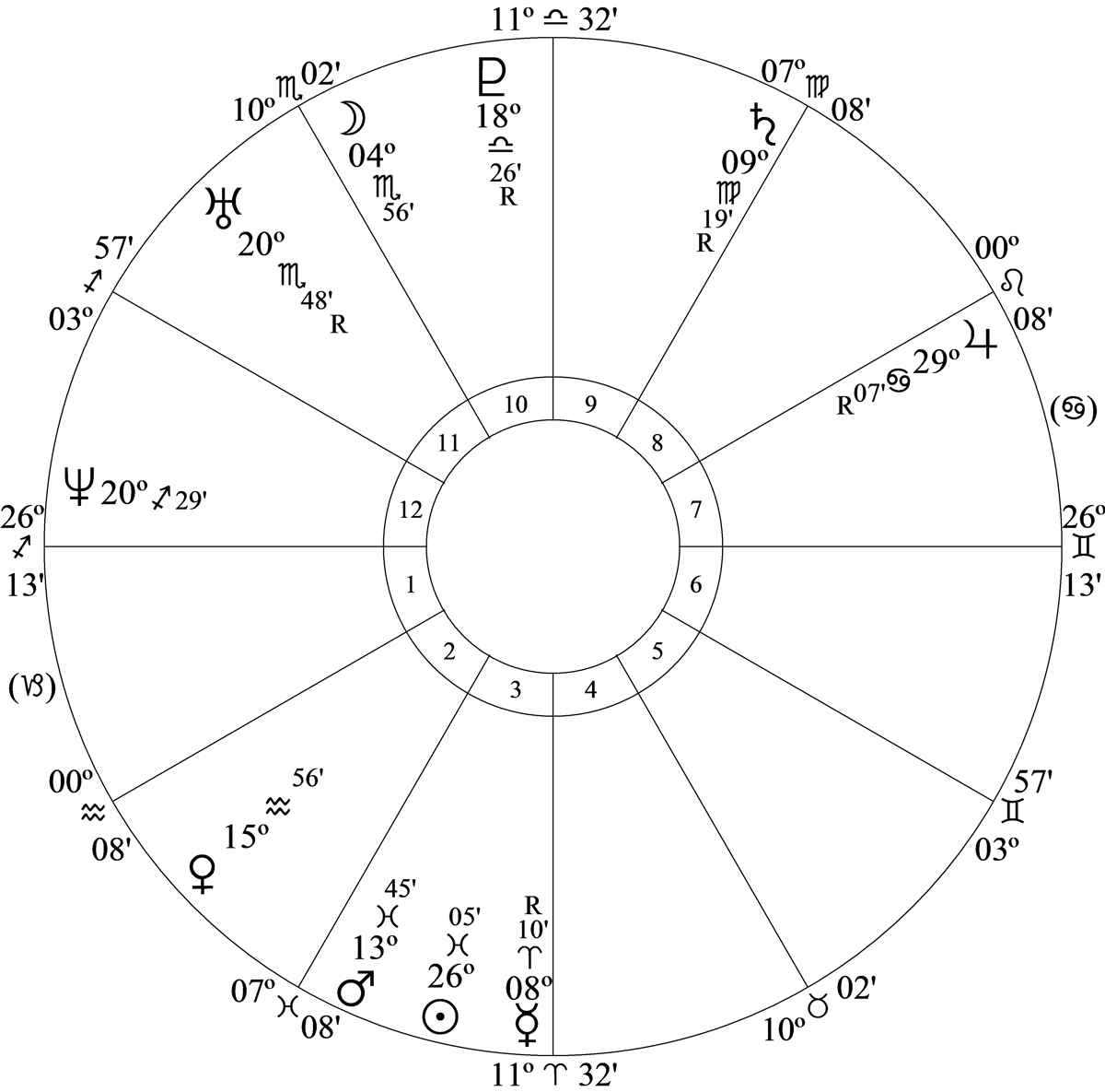 Sun is in the third – vicissitudes – decanate of Pisces and her inner need for an exciting life has seen a diversity of experience and lots of change. Sun is trine Jupiter, trine Uranus and square Neptune (her desire for fantasy) in house 12 (disappointment and restriction).