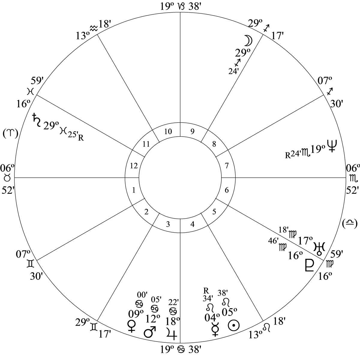 Pluto in her chart moved to house 5 at 11.56.20 (and she has 5 children); the Moon moved to house 8 at 11.57.34pm; and Uranus moved to house 5 at 11.57.55pm. The house positions of Moon and Uranus are uncertain.