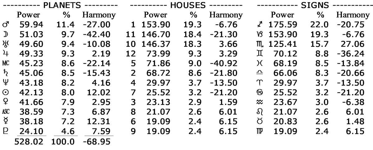 Mars, Moon, Uranus, Jupiter, Midheaven, Saturn and Neptune have above average power and played an influential role in his life.