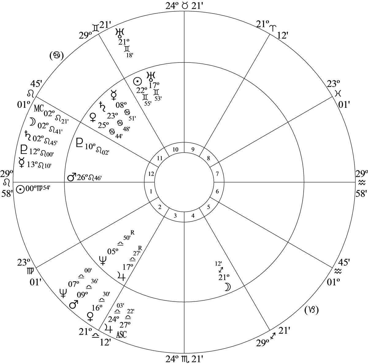Progressed Midheaven at 23 Pisces 41 in house 12 was trine birth chart Mars at 23 Cancer 58 in house 4; progressed Mars at 5N40 in house 4 was parallel birth chart Pluto at 6N05 in house 5; and progressed Mercury at 23 Sagittarius 08 – the ruler of house 7 in house 9 – was opposition birth chart Moon at 22 Gemini 37 in house 3 and inconjunct birth chart Mars.
