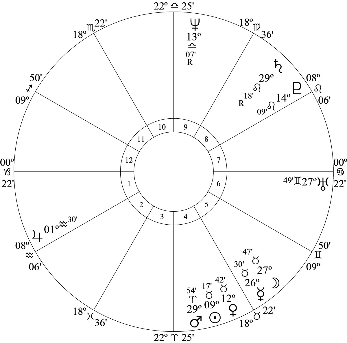 The Sun-Venus conjunction is in the first decanate – determination – and he has the ability to crystallize conditions to his desires by the power of his imagination.