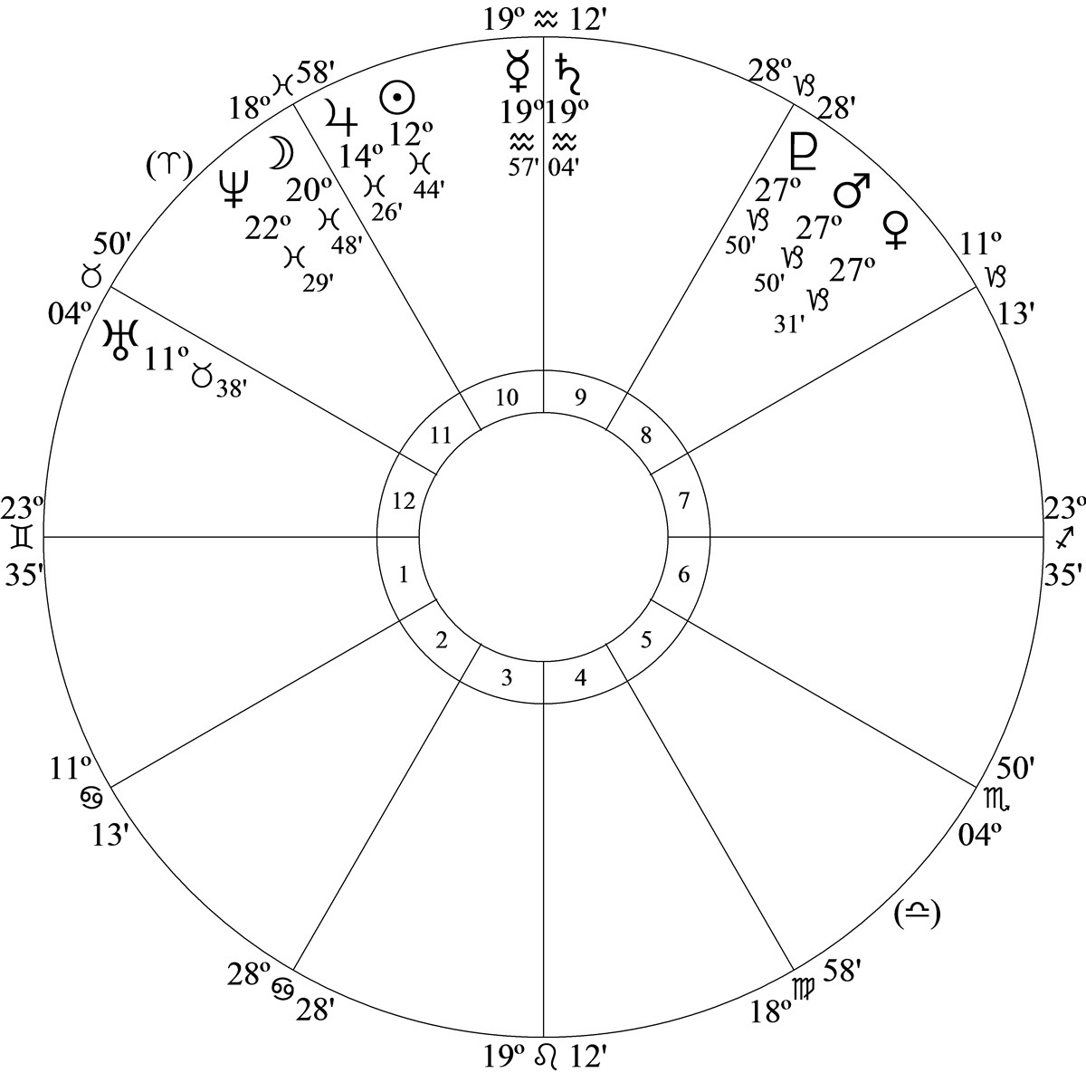 The chart has Mars and Pluto in house 8 – very close to the cusp of house 9. If Mars makes the conjunction of Pluto before 10.37am Mars and Pluto are in house 9. This seems unlikely. The chart presented can be viewed as accurate.