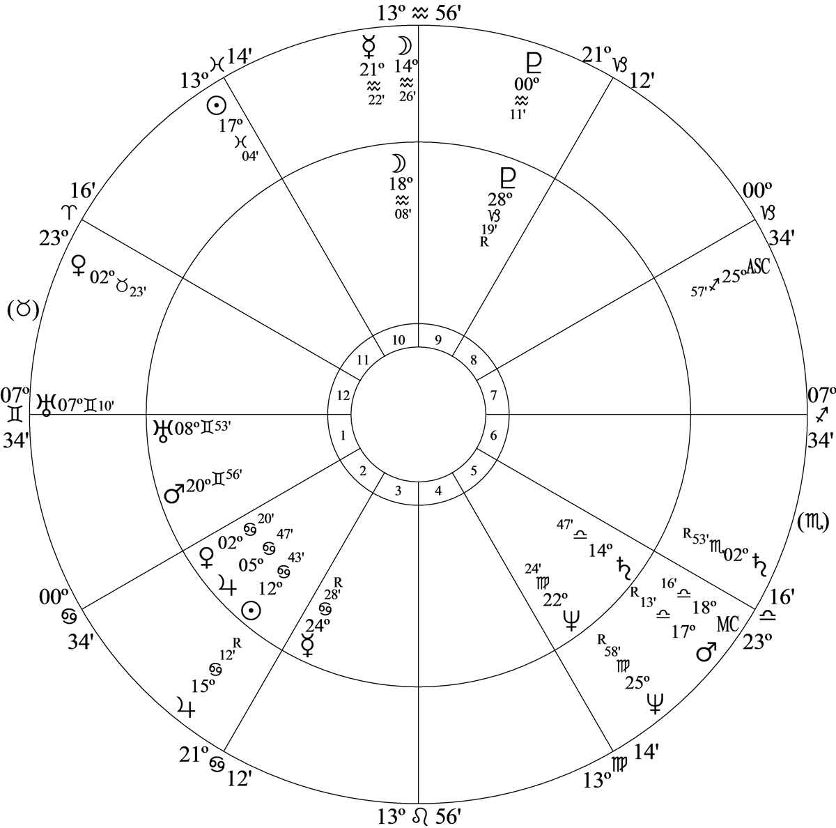 Progressed Sun at 17 Pisces 04 in house 11 was inconjunct progressed Mars at 17 Libra 13R in house 5 and progressed Mars at 3S48 was parallel birth chart Neptune at 4N09 in house 5.