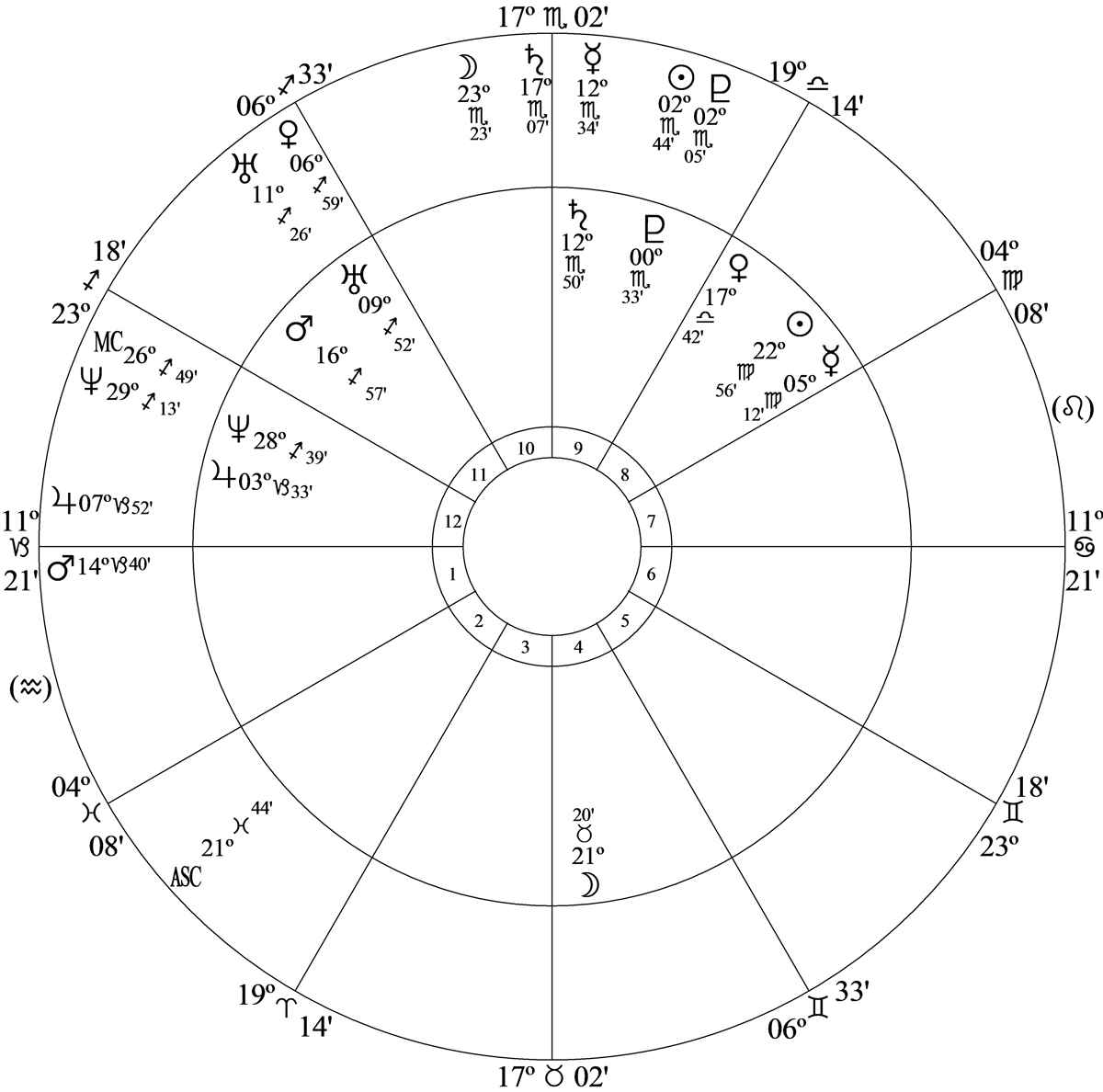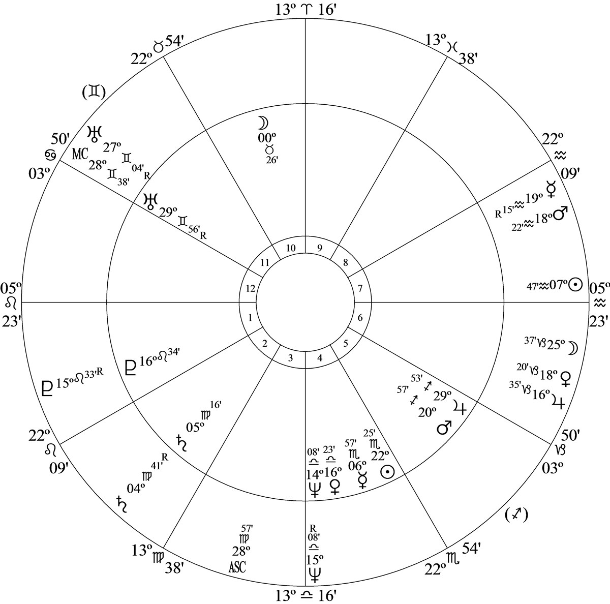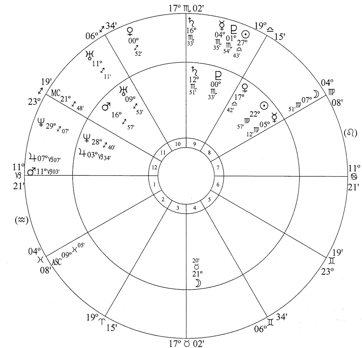 Moon (his mind/mentality) in house 10 (his reputation) is in Lepus – the determination decanate of Taurus. It dominates his chart and is opposition Mercury and square ascendant. Saturn at 5 Virgo 16 in house 2 (his personal finances) intercepts the Moon-Mercury opposition providing him with practical, sober relief from the high discord gossip, controversy and mental conflict.