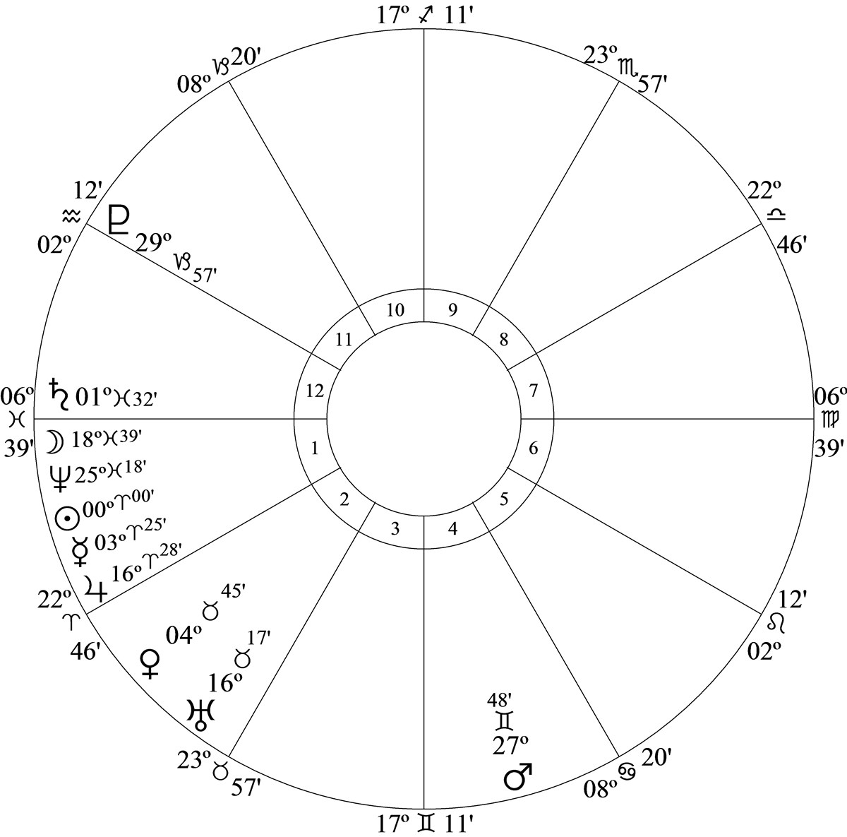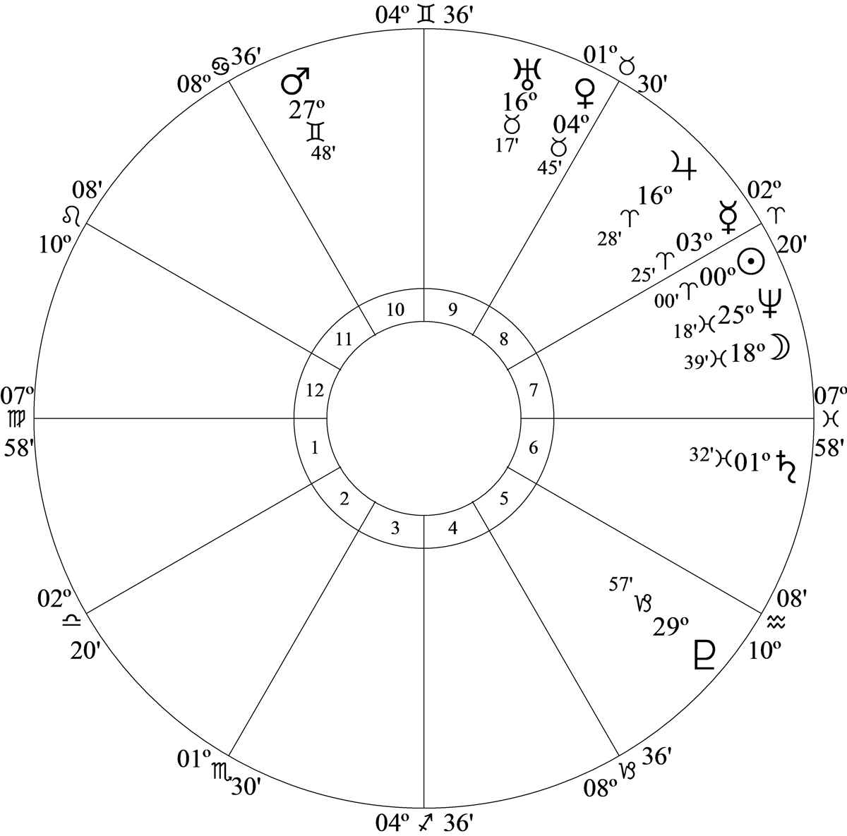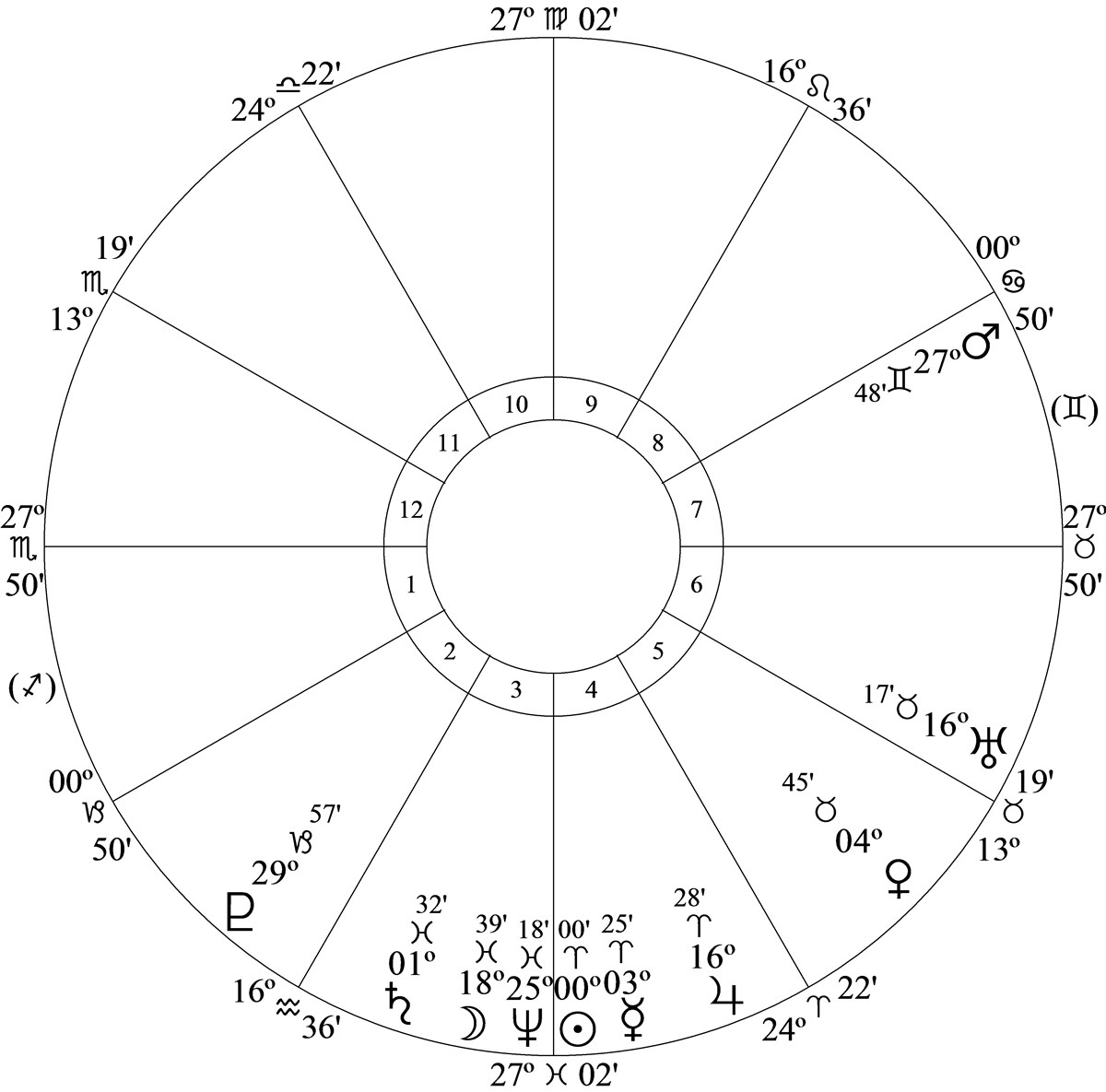 The chart’s central focus is the house positions of the Sun and those planets that aspect the Sun. The event trend, whether fortunate or unfortunate, is chiefly determined by these aspects to the Sun.