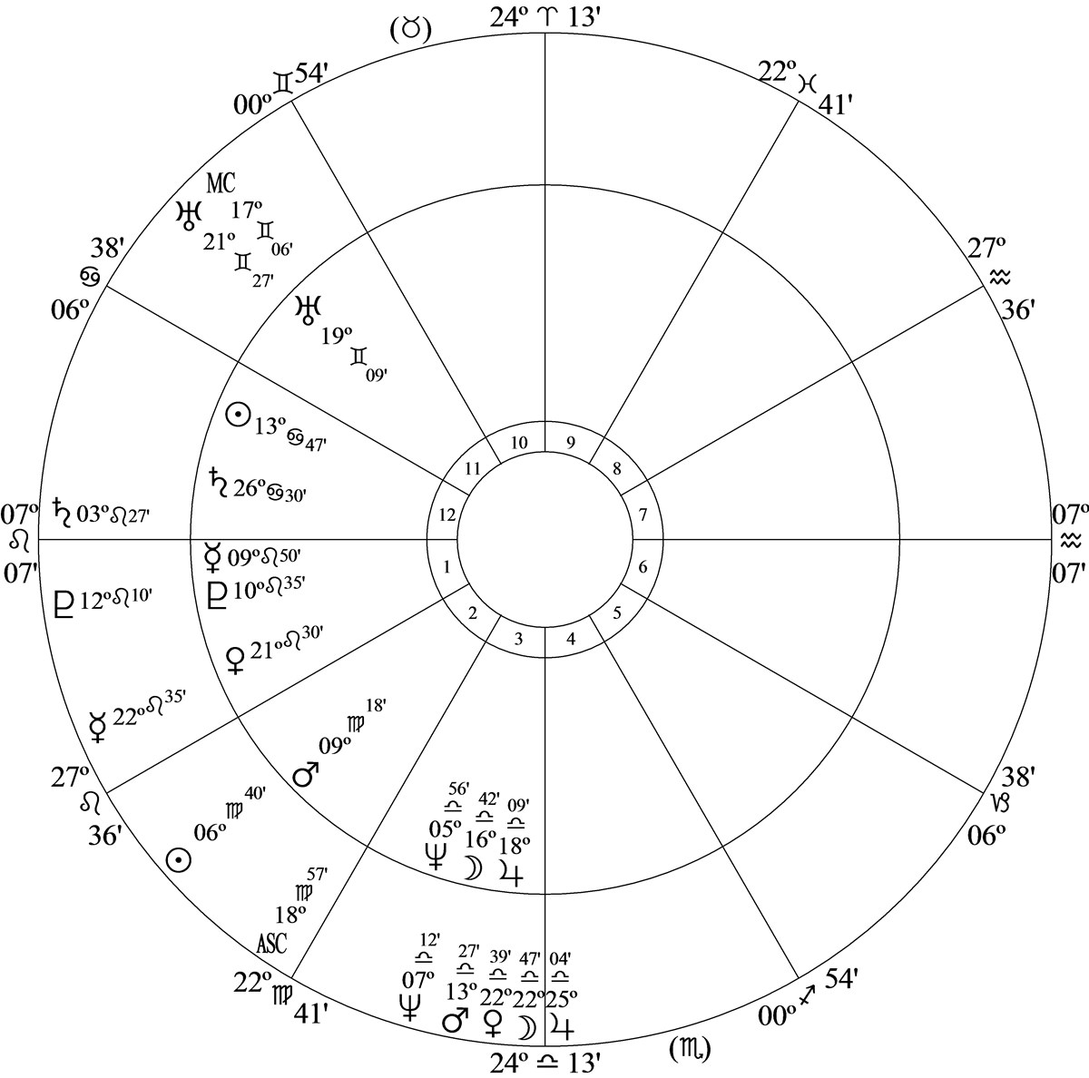 And progressed Moon at 21 Taurus 26 in house 12 was semisquare birth chart Jupiter at 5 Cancer 47 stimulating the major Mercury-Jupiter progressed sesquisquare aspect.