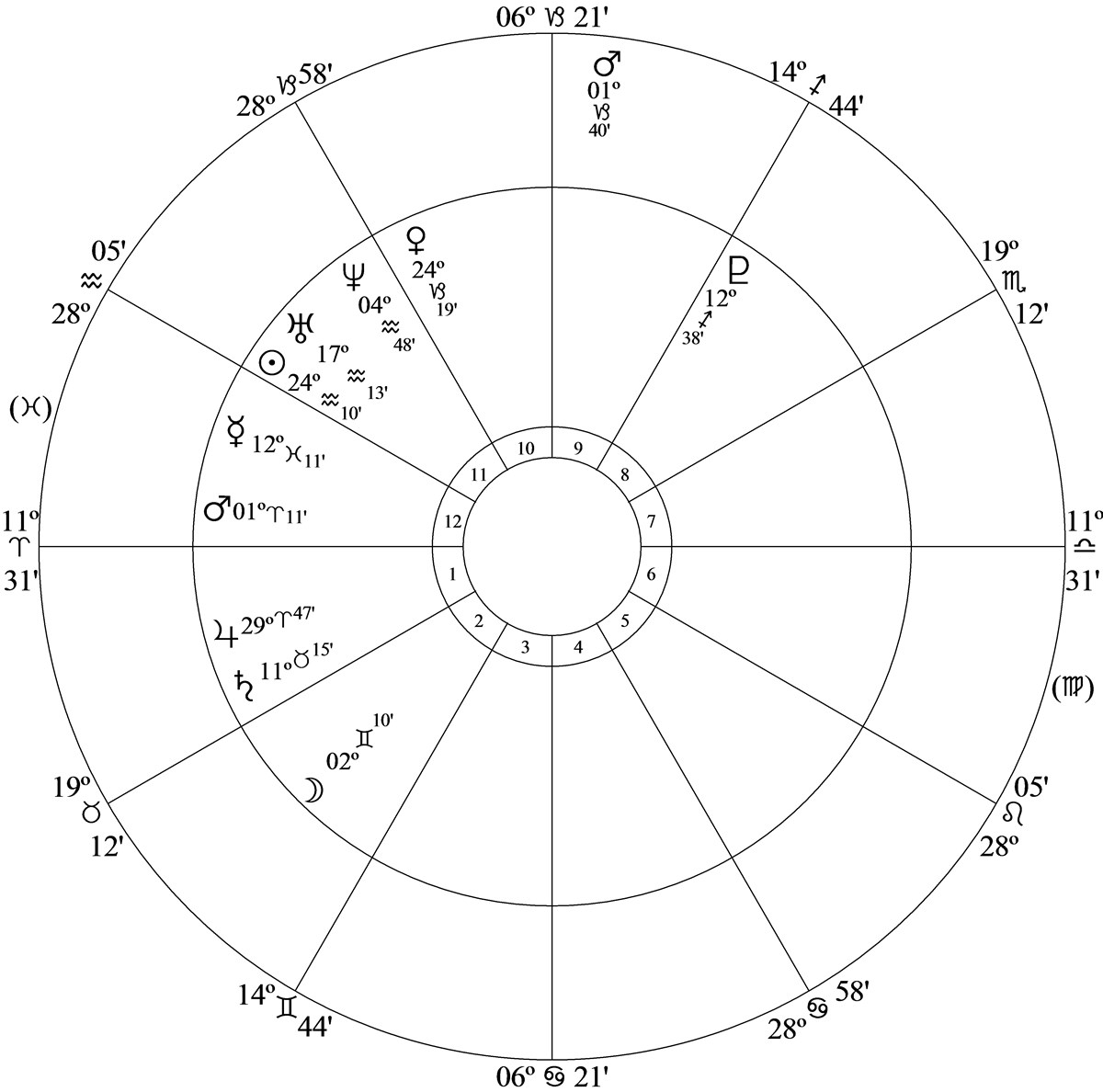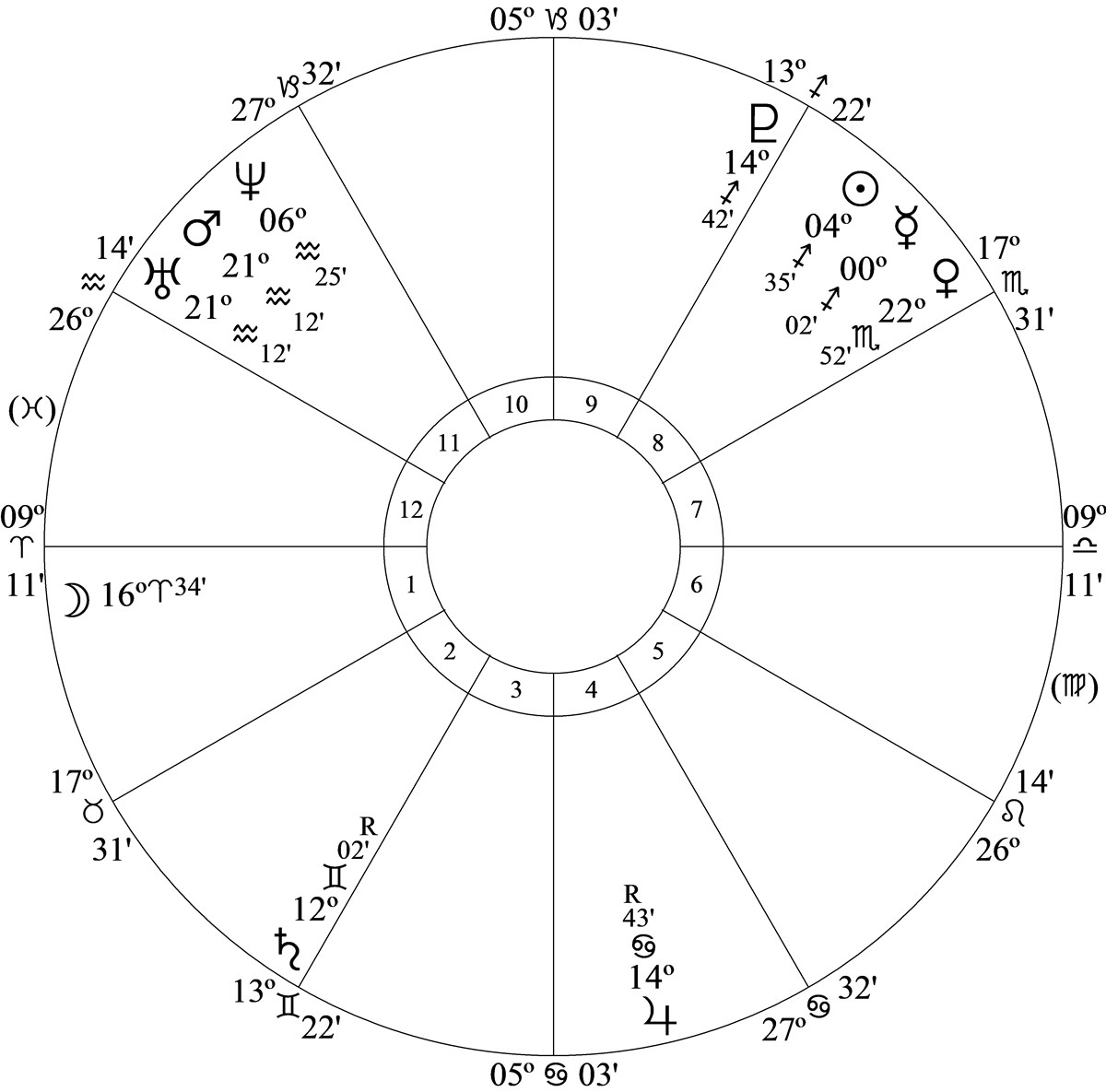 Sun is in house 12 (secret enemies, self-undoing and disappointment). Pluto – coercion – is in house 1 conjunction Mercury. Uranus – planet of extremists – in house 11 (Congress) is the cusp ruler of house 7 (enemies and war). Both Pluto and Uranus have above average astrodyne power. Mars (war) in house 2 is sextile Sun. Sun and Mars have below average astrodyne power.