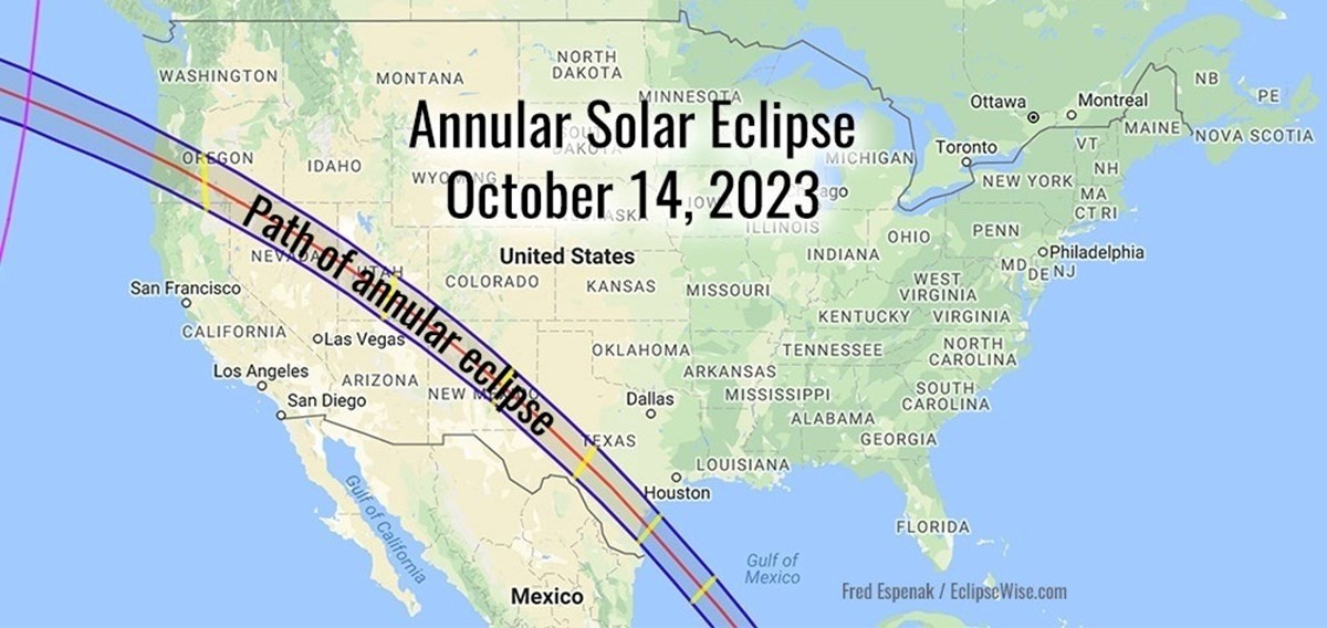 On October 14, 2023 America will experience a solar blackout when the Moon eclipses the Sun’s light but it isn’t a total solar eclipse. It’s an annular solar eclipse that will turn the Sun into a ‘ring of fire.’ With cloud free skies the viewing audience will experience the celestial spectacle with annularity lasting from 2 to 5 minutes.