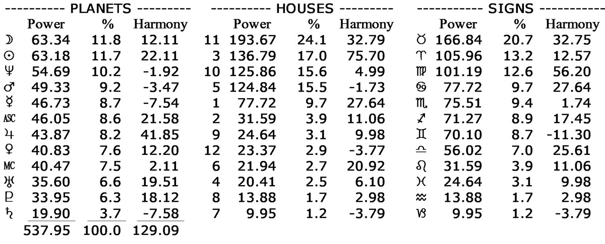 With 9 lucky trines his chart is very high in harmony. Saturn, planet of hardship and loss, is weakest, so there hasn’t been much struggle. Harmony has nothing to do with decency, honesty and noble behavior – they’re learned and acquired: it’s about getting the lucky breaks that allow him to do what he wants.