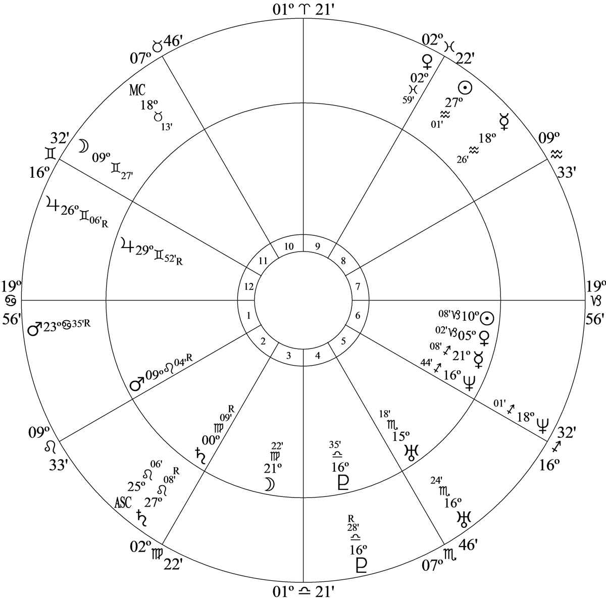 Ascendant is in the revelation decanate of Cancer so he’s very emotional and struggles with sensual desires and the limitations imposed by death. Ascendant discord inclines towards problems due to negative mediumship.