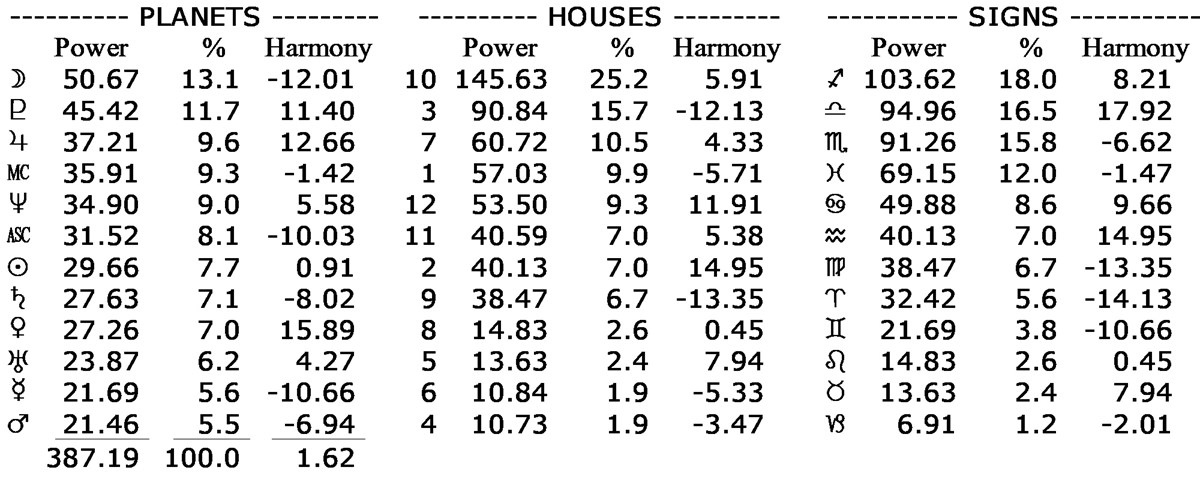 Moon, Pluto, Jupiter, Midheaven and Neptune have above average power and Mercury and Mars are weakest. When she was born Mercury, Jupiter, Saturn, Uranus, Neptune and Pluto were retrograde. Mercury and Jupiter have since turned direct.