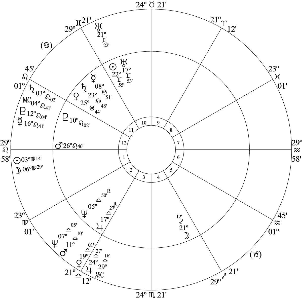 Progressed Sun at 3 Virgo 15 in house 1 – the chief ruler of house 10 – was semisquare birth chart Jupiter at 17 Libra 27R in house 2 and semisextile progressed Saturn at 3 Leo o2 in house 12.
