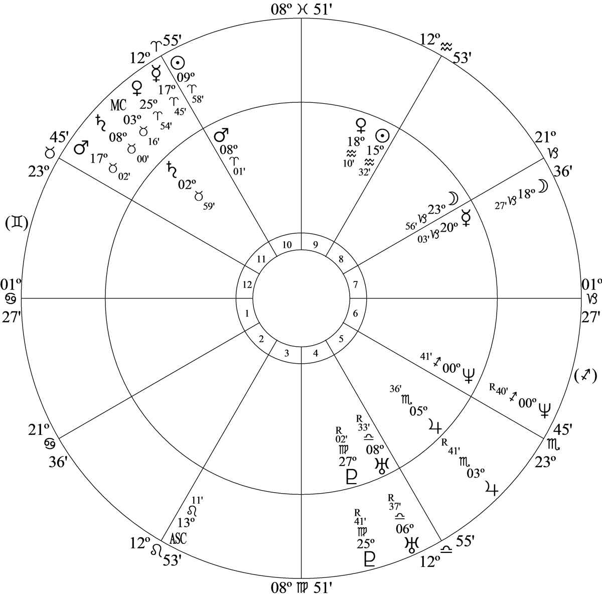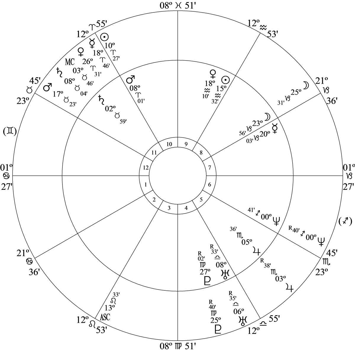 Moon is conjunction Mercury in the idealism decanate of Capricorn and he has a talent for turning the ideal into concrete reality. He’s quite psychic and with the Moon in house 8 he regularly receives messages from those who live in the astral world.