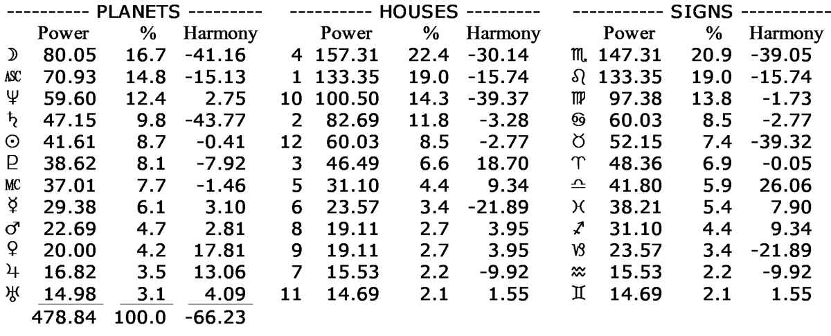 Moon, ascendant, Neptune, Saturn, Sun and (Pluto almost) had prominence status. Moon, ascendant and Saturn are high is discord.
