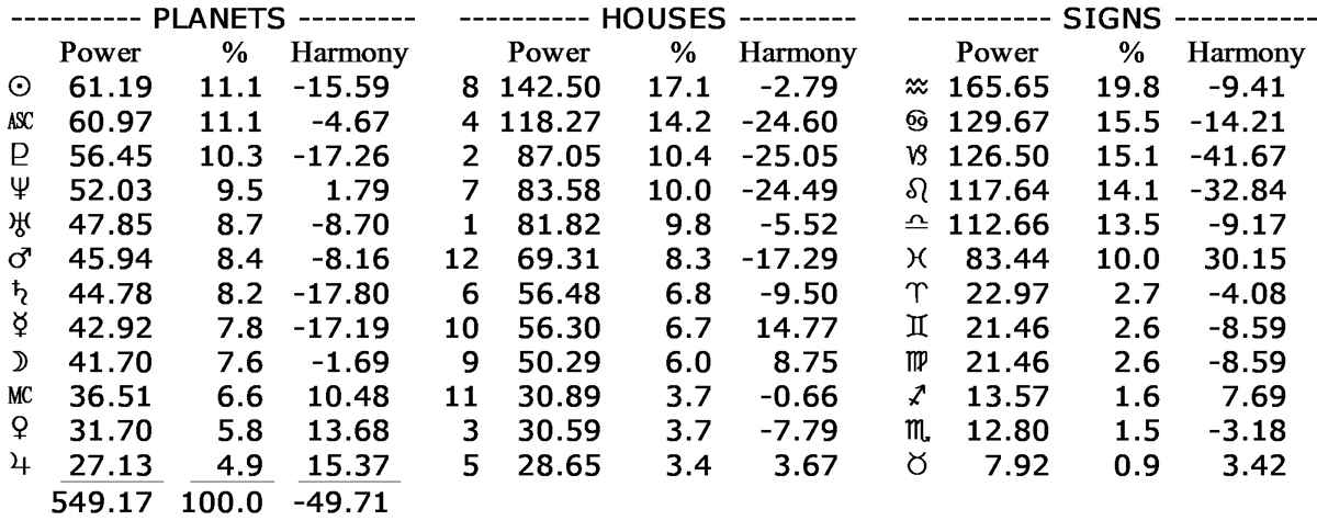 Sun, ascendant, Pluto, Neptune, Uranus and Mars are prominent with above average power.