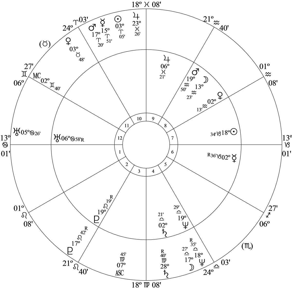 Sun (his power urge) dominates from house 7 (the public’s attitude and open enemies). It’s in Delphinus the decanate of martyrdom and he has a remarkable ability to make the most of his environment. He’s a persistent, tireless worker who can suffer because of his beliefs and objectives.