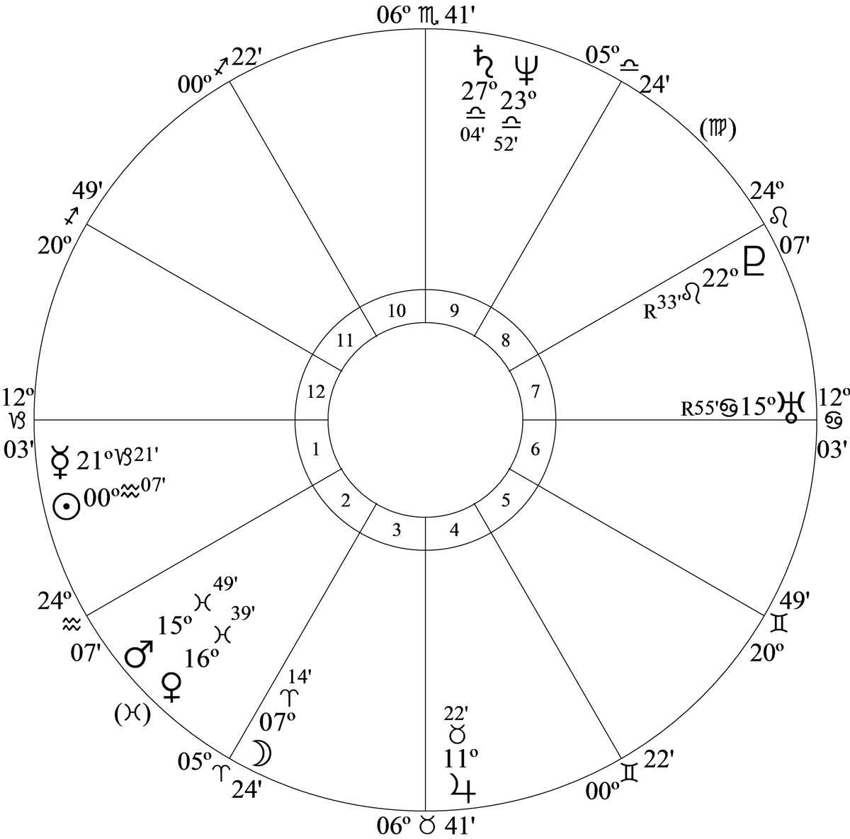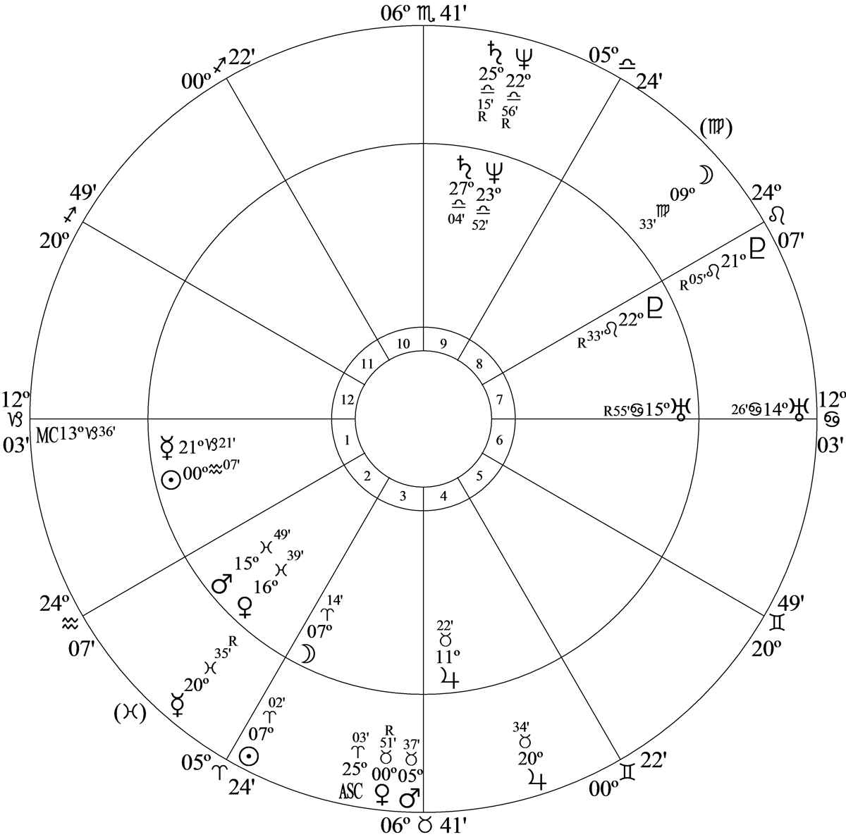 Progressed Mercury – the intercepted ruler of house 8 – at 20 Pisces 35R in house 2 was semisquare progressed Mars at 5 Taurus 37 in house 3.