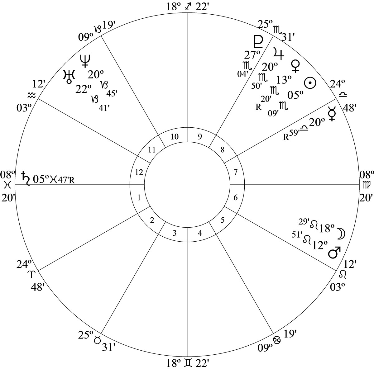 Scorpio, the dominant sign, is high in harmony so she’s energetic, determined and skilful and with the Sun in the first decanate her I desire individuality is more precisely defined by resourcefulness. But her fanatical sense of duty and strong sex drive, unless harnessed to a constructive, creative endeavor, will cause her trouble.