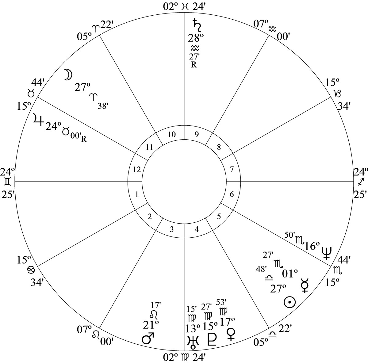 The Sun dominates. It’s in the third decanate of Libra – Lupus – and the special feature of her I balance individuality is her brilliant mind and keen interest in literature and people. She can be tempted to use her mental cleverness to unfair advantage but if she’s found out and she’ll suffer expiation.
