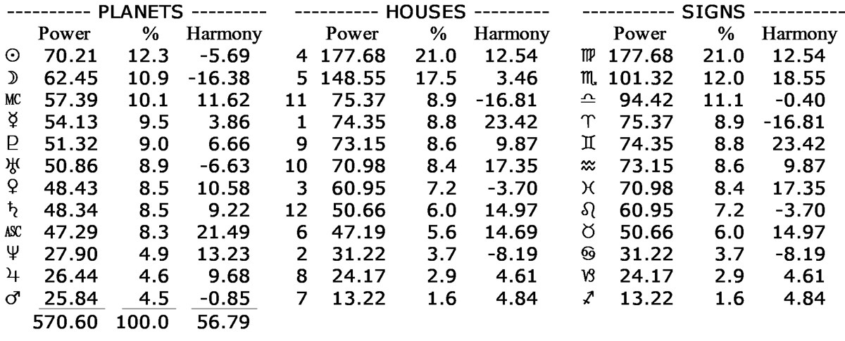 The Sun, Moon, Midheaven Mercury, Pluto, Uranus, Venus, Saturn and ascendant have above average astrodyne power and prominence status.