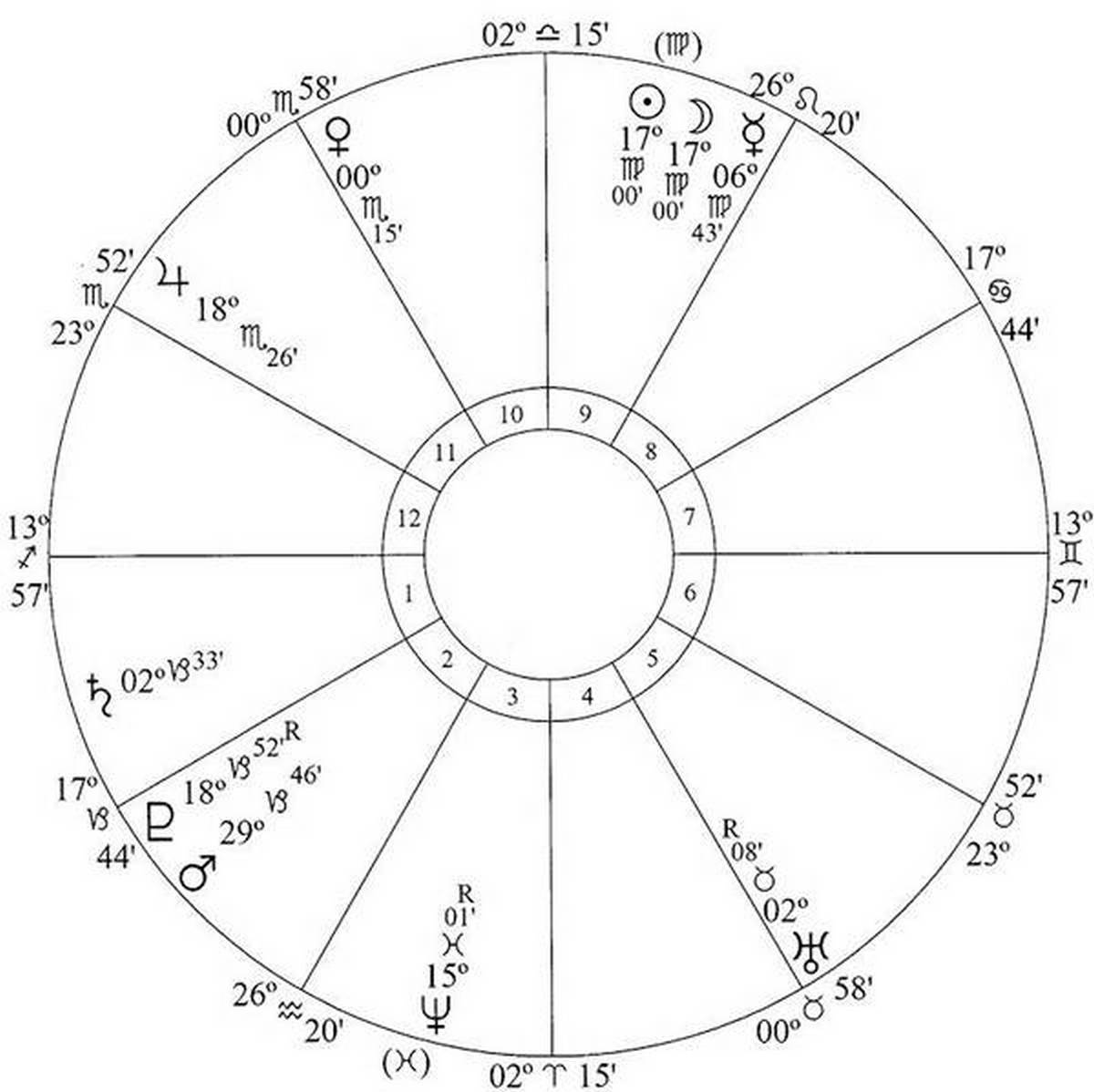 The Sun-Moon conjunction is sesquisquare Mars, sextile Jupiter, sesquisquare Uranus, opposition Neptune and trine Pluto.