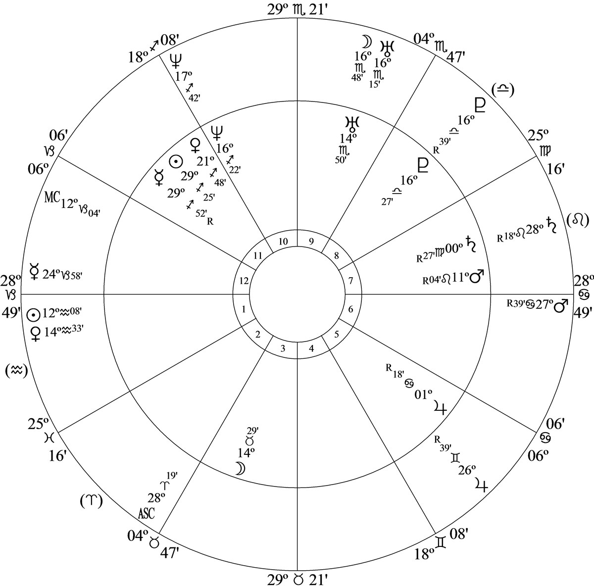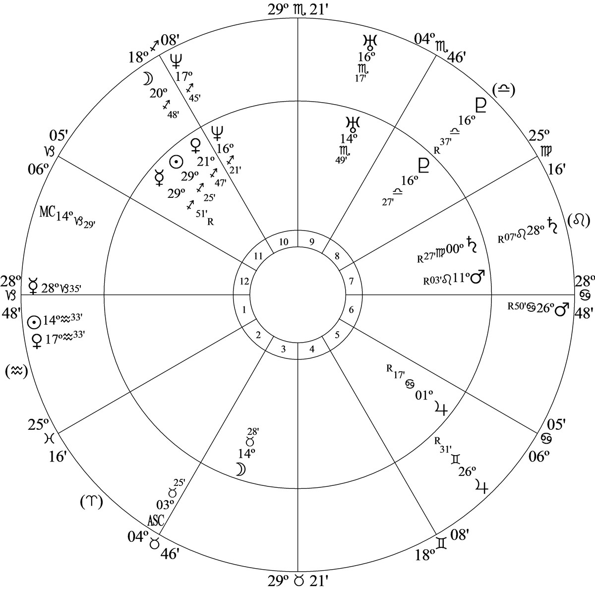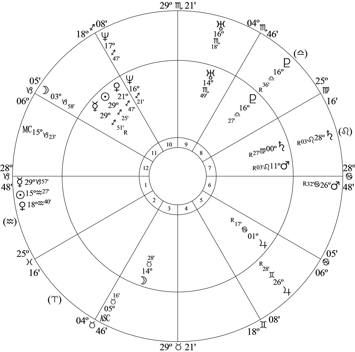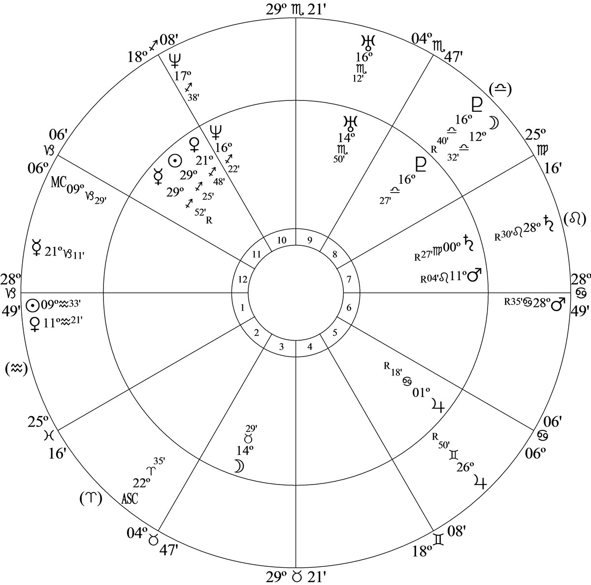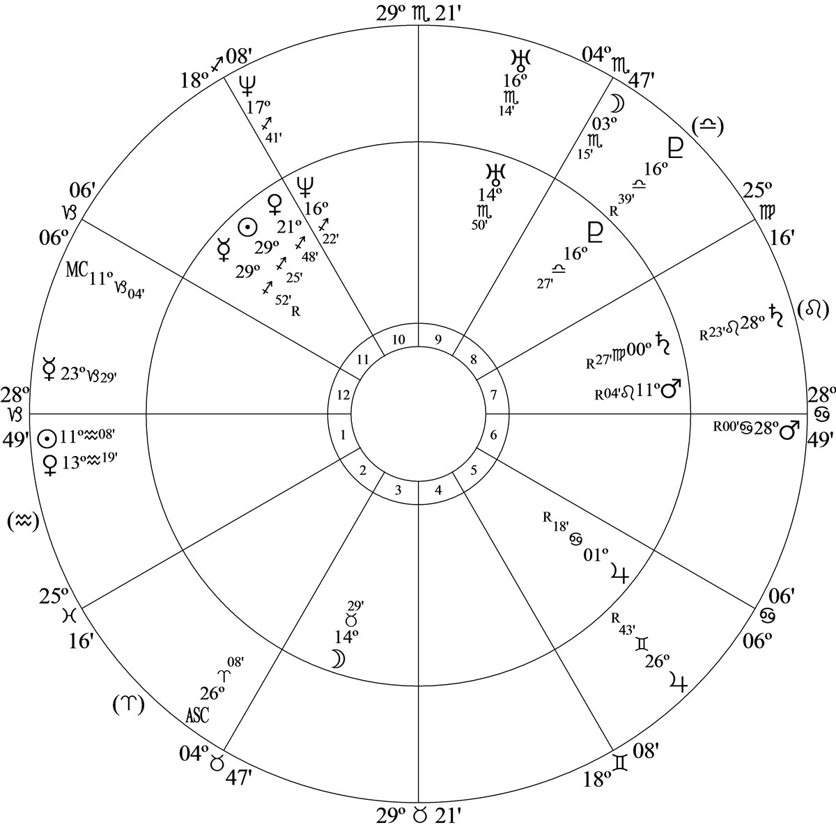 Progressed Sun at 14 Aquarius 33 – his desire for power and significance – in house 1 (his personality) was semisquare birth chart Mercury at 29 Sagittarius 51R in house 11; square birth chart Moon (the populace) at 14 Taurus 28 in house 3; and square birth chart Uranus – planet of the unexpected – at 14 Scorpio 49 in house 9.
