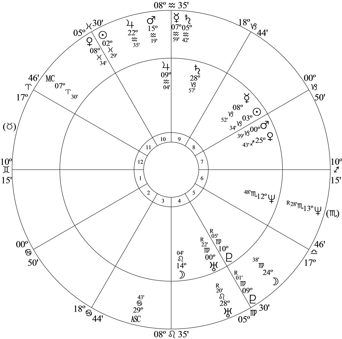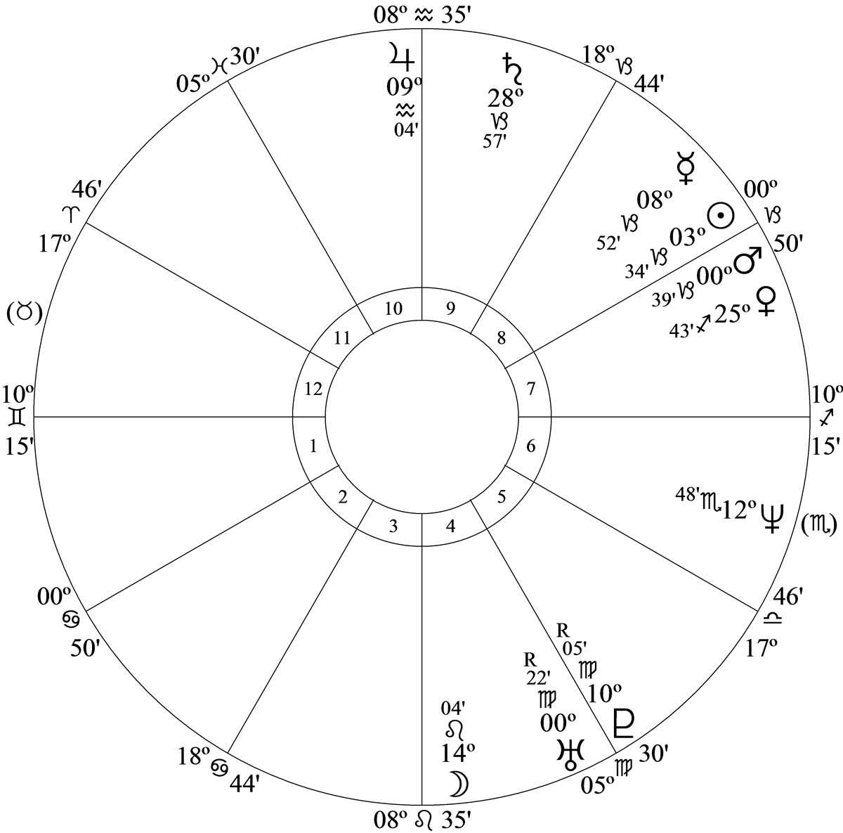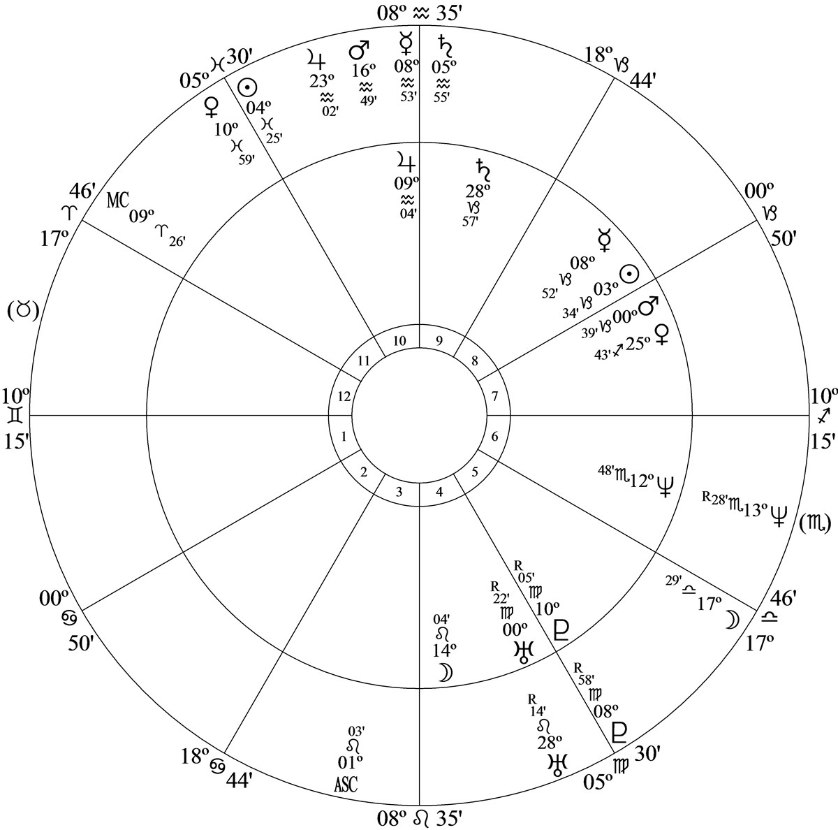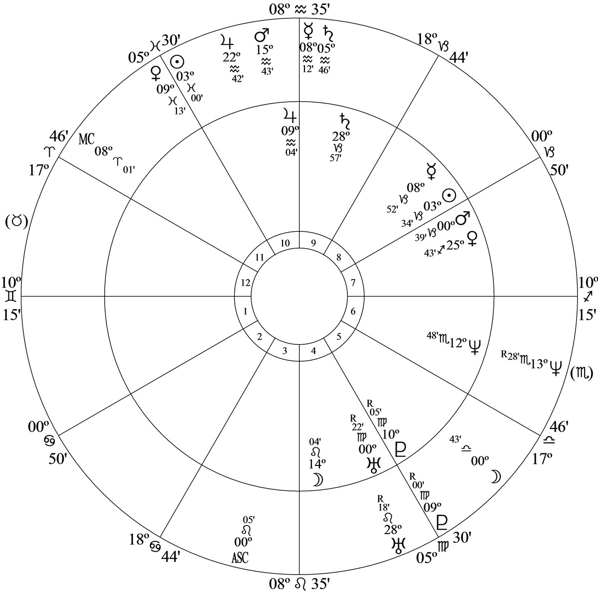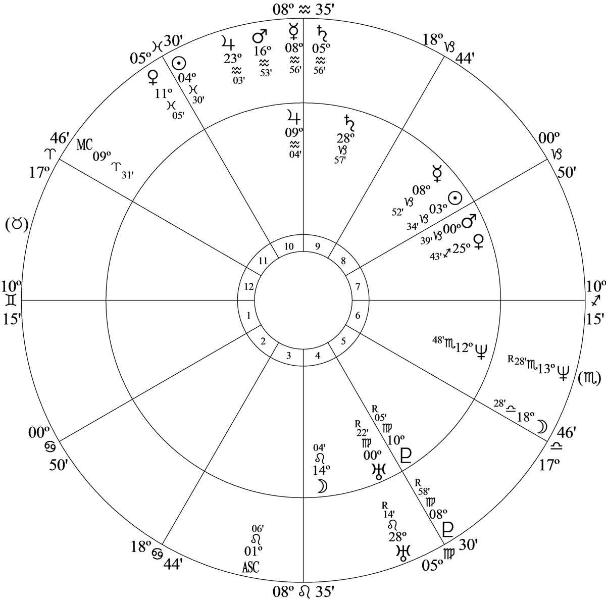 Progressed Mercury at 9 Aquarius 13 and 17N00 in house 10 was parallel progressed Mars and inconjunct progressed Pluto at 8 Virgo 57R in house 5.
