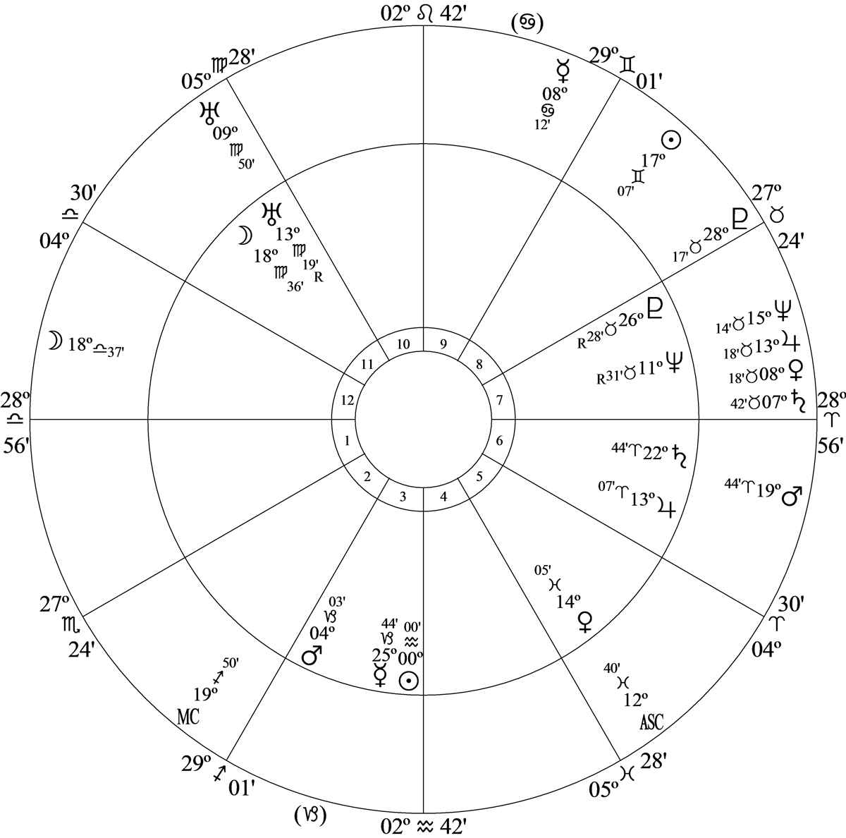 Progressed Moon in house 12 (sorrow) at 11S56 was parallel progressed Venus at 12N09 in house 7 and progressed Saturn – planet of grief and mourning) – at 11N57 in house 7.
