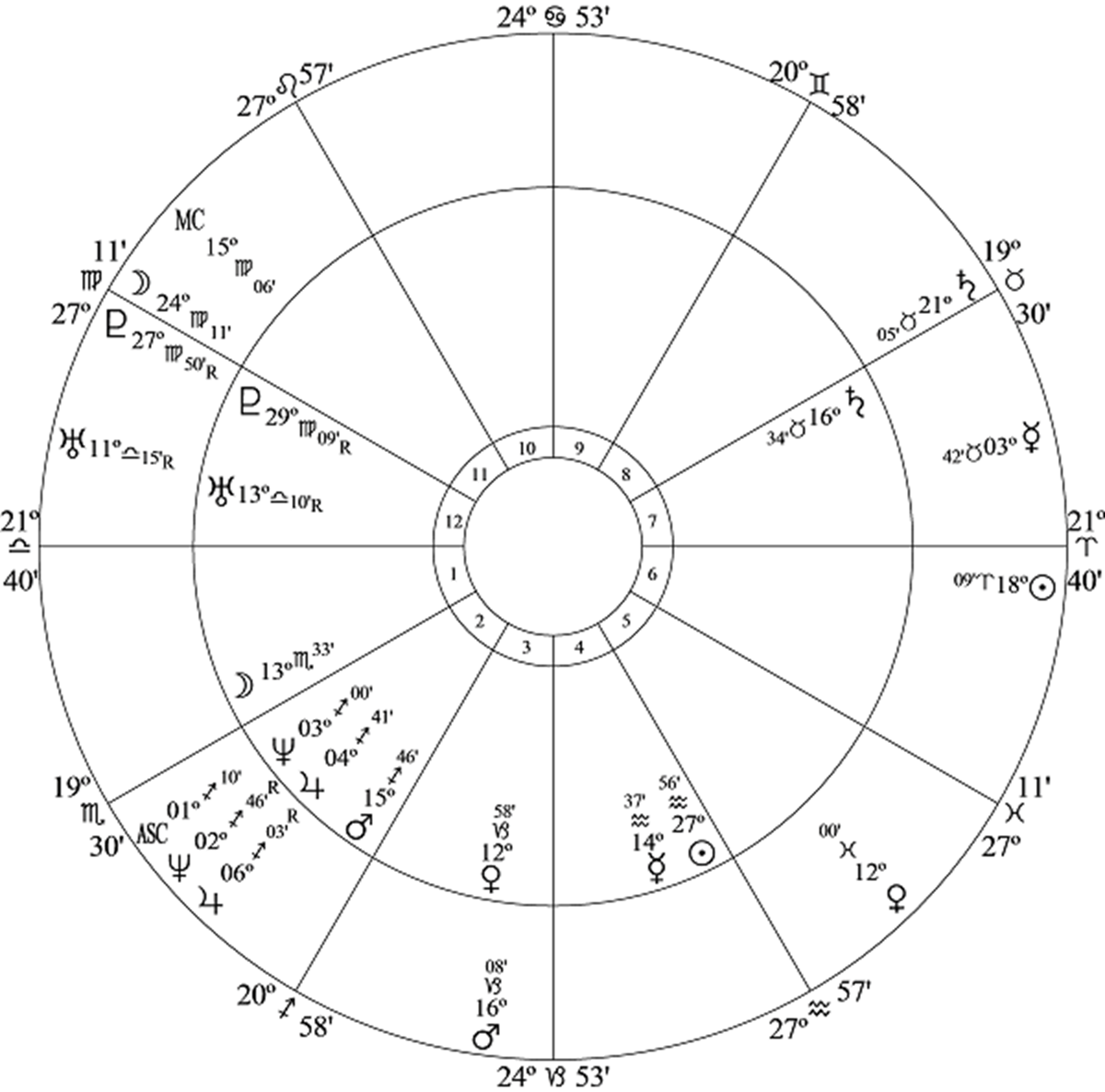 Progressed Mercury at 3 Taurus 25 and 15N37 in house 7 (the prosecution) and cusp ruler of house 9 (the court case) was inconjunct birth chart Neptune – planet of nonviolent crime – at 3 Sagittarius 00 in house 2 (finances) and parallel birth chart Pluto – planet of extortion – at 15N22 in house 12 (crime and imprisonment).