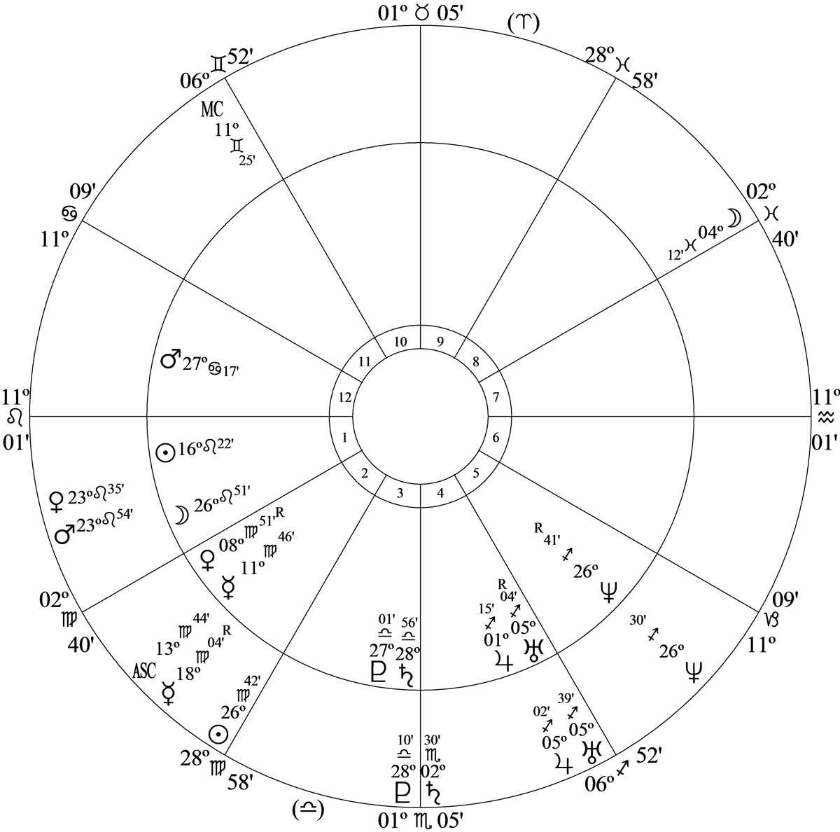 Progressed Midheaven at 11 Gemini 25 in house 11 was square birth chart Mercury at 11 Virgo 46 in house 2, semisquare birth chart Mars in house 12 and sesquisquare birth chart Pluto.