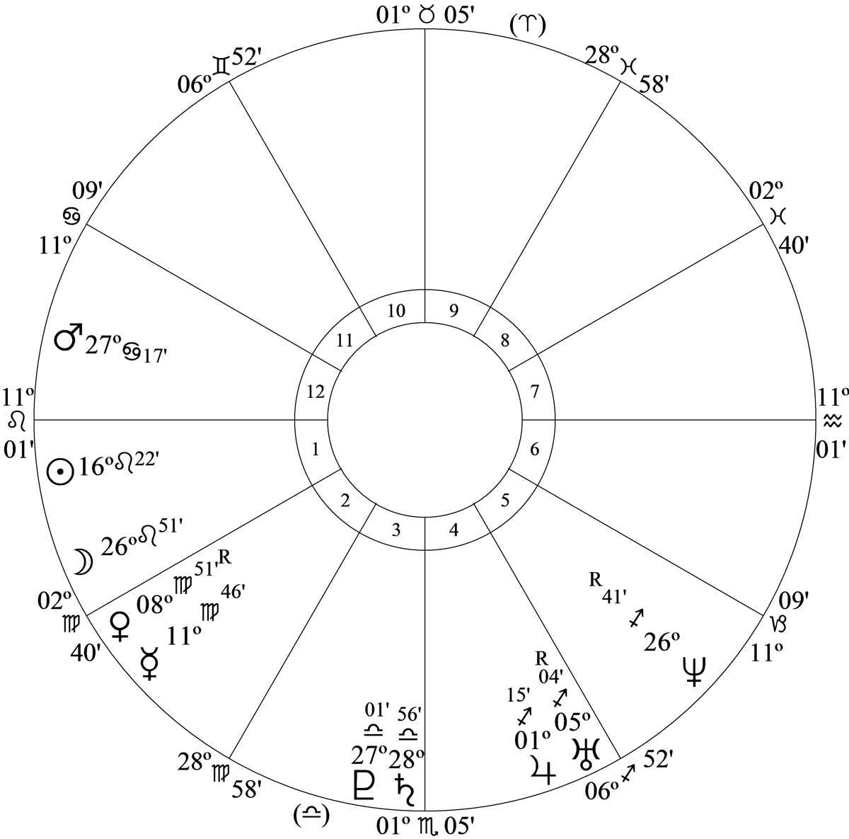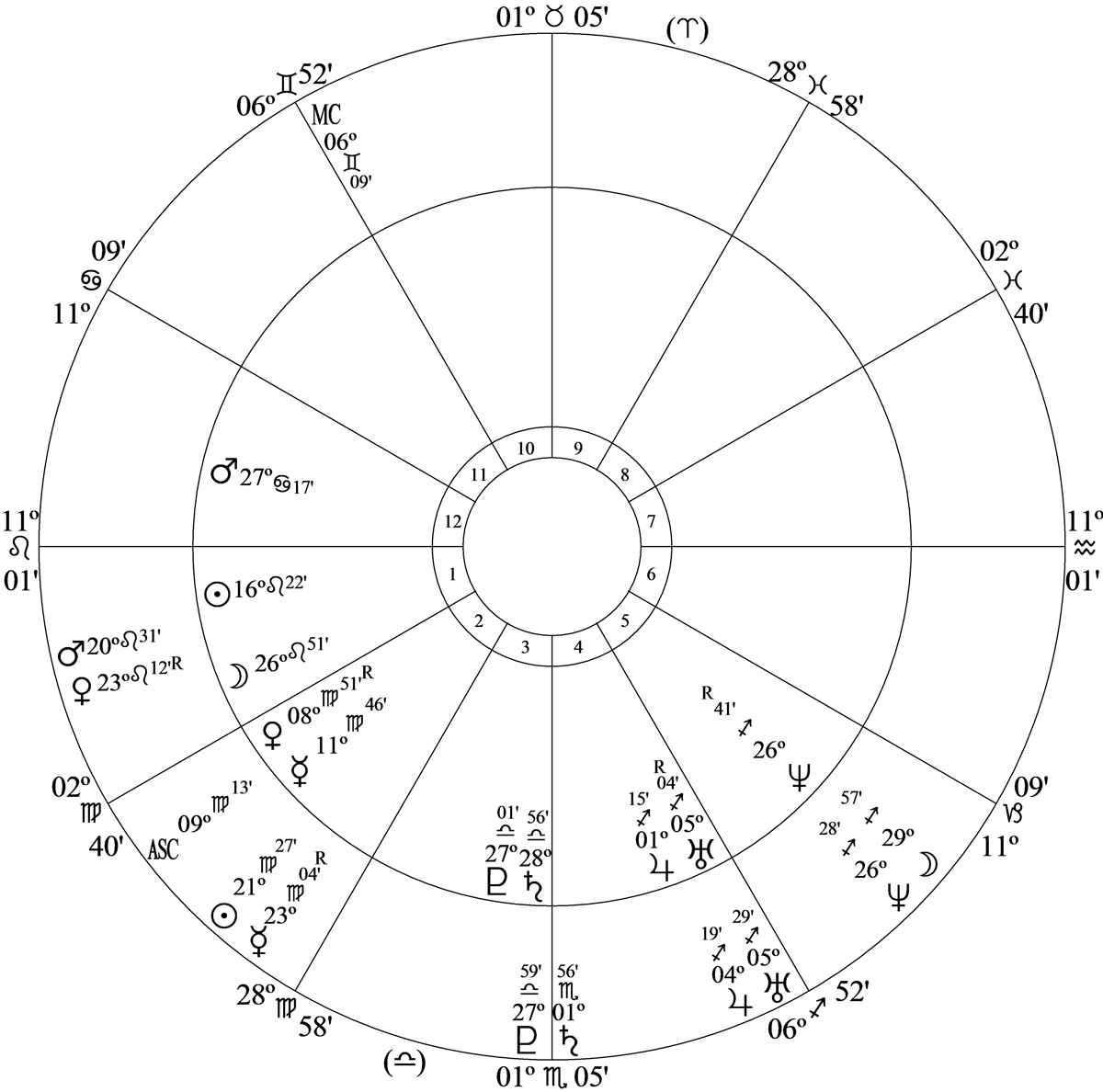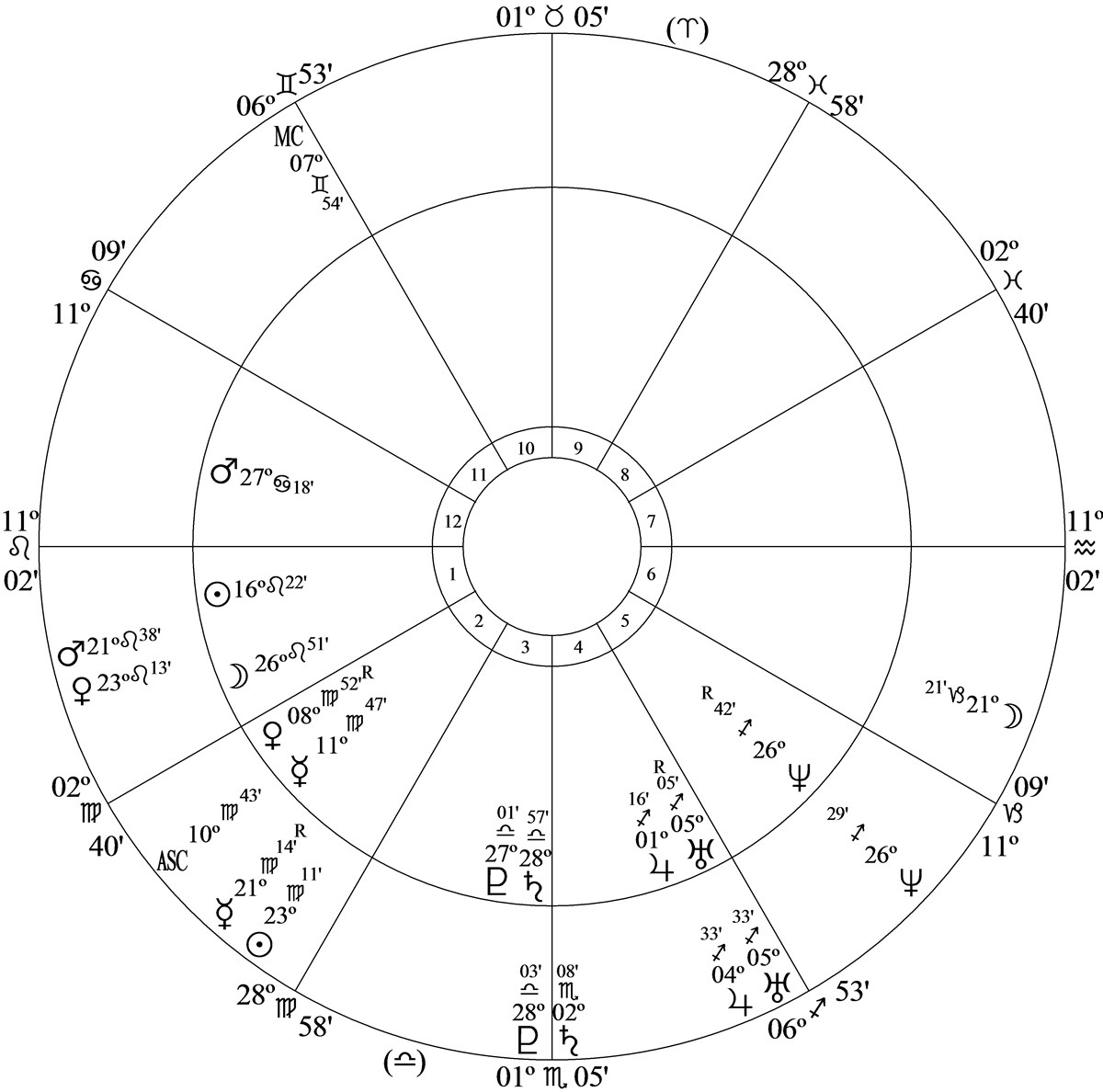 Progressed ascendant at 9 Virgo 13 in house 2 was conjunction birth chart Venus at 8 Virgo 51R in house 2; and progressed Midheaven at 6 Gemini 09 in house 10 was opposition progressed Uranus at 5 Sagittarius 20 in house 4.