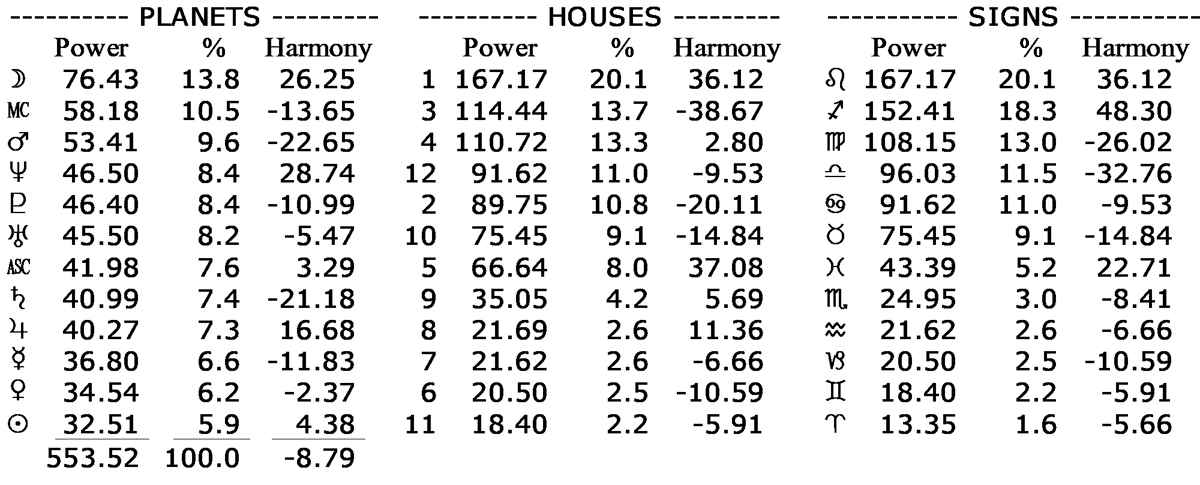Neptune in house 5 (sex) maps a potential to be deceived and tricked in regard to sexual matters. Sun in house 1 is her weakest planet.
