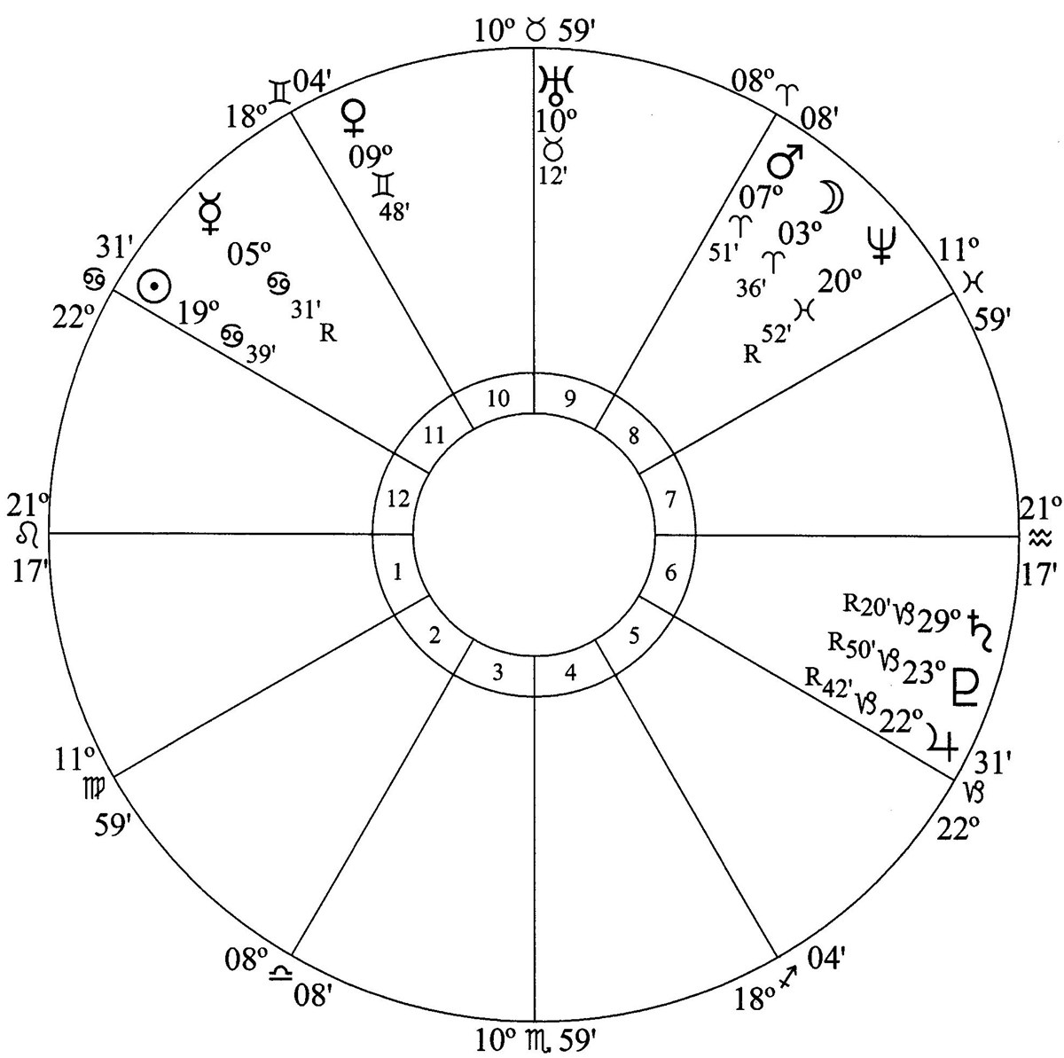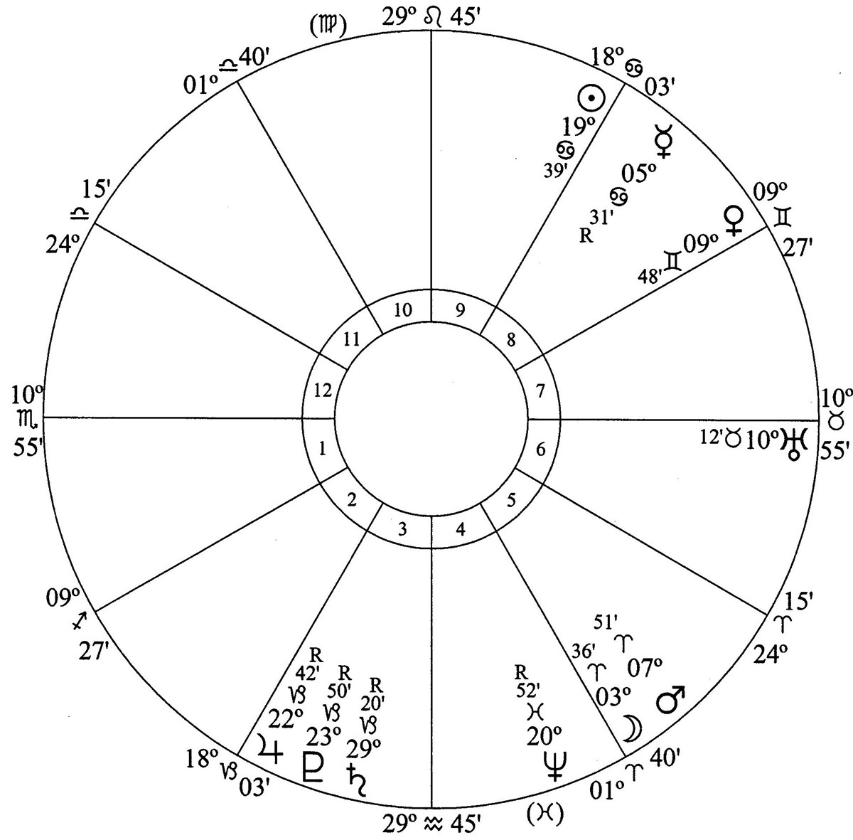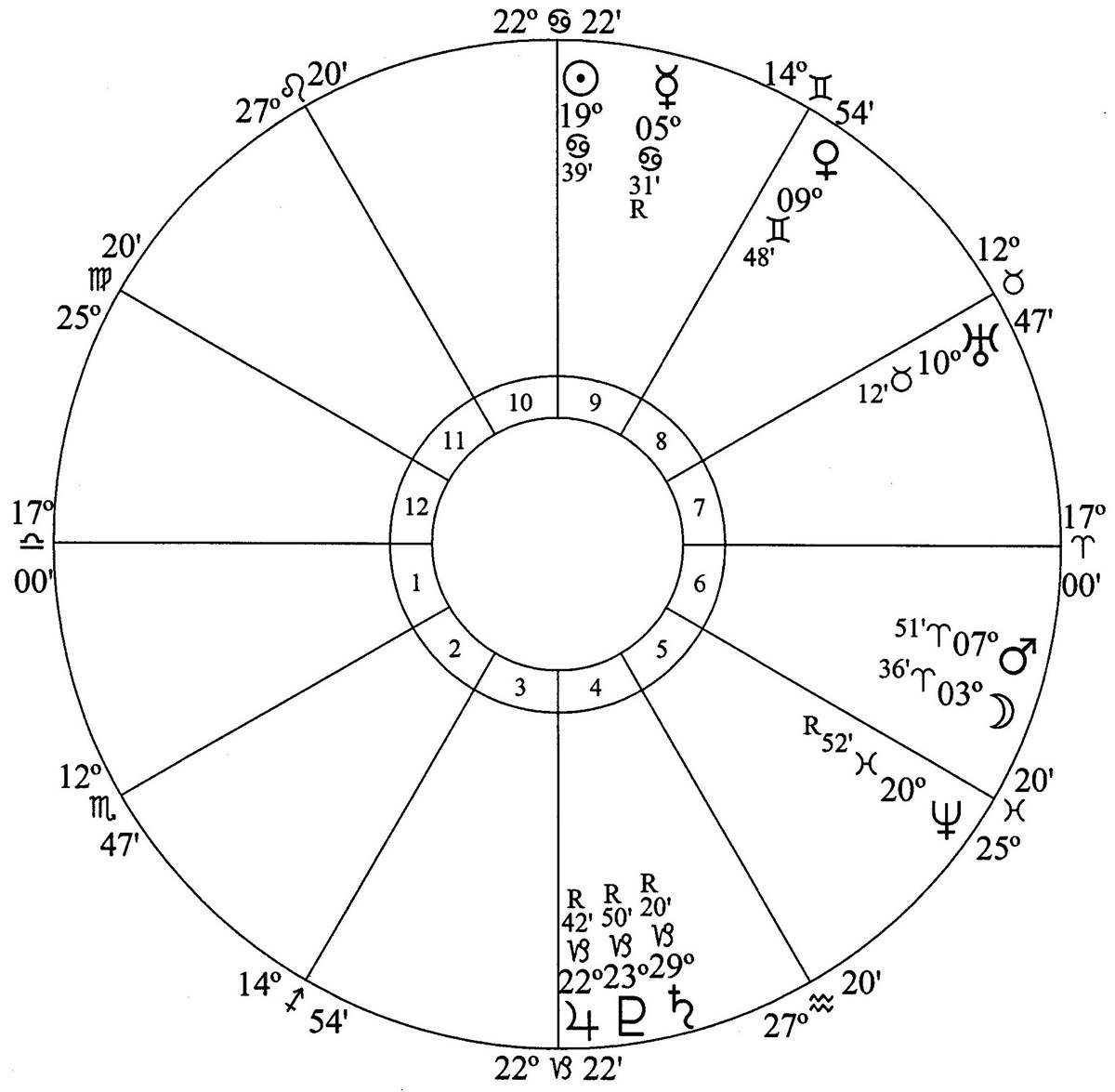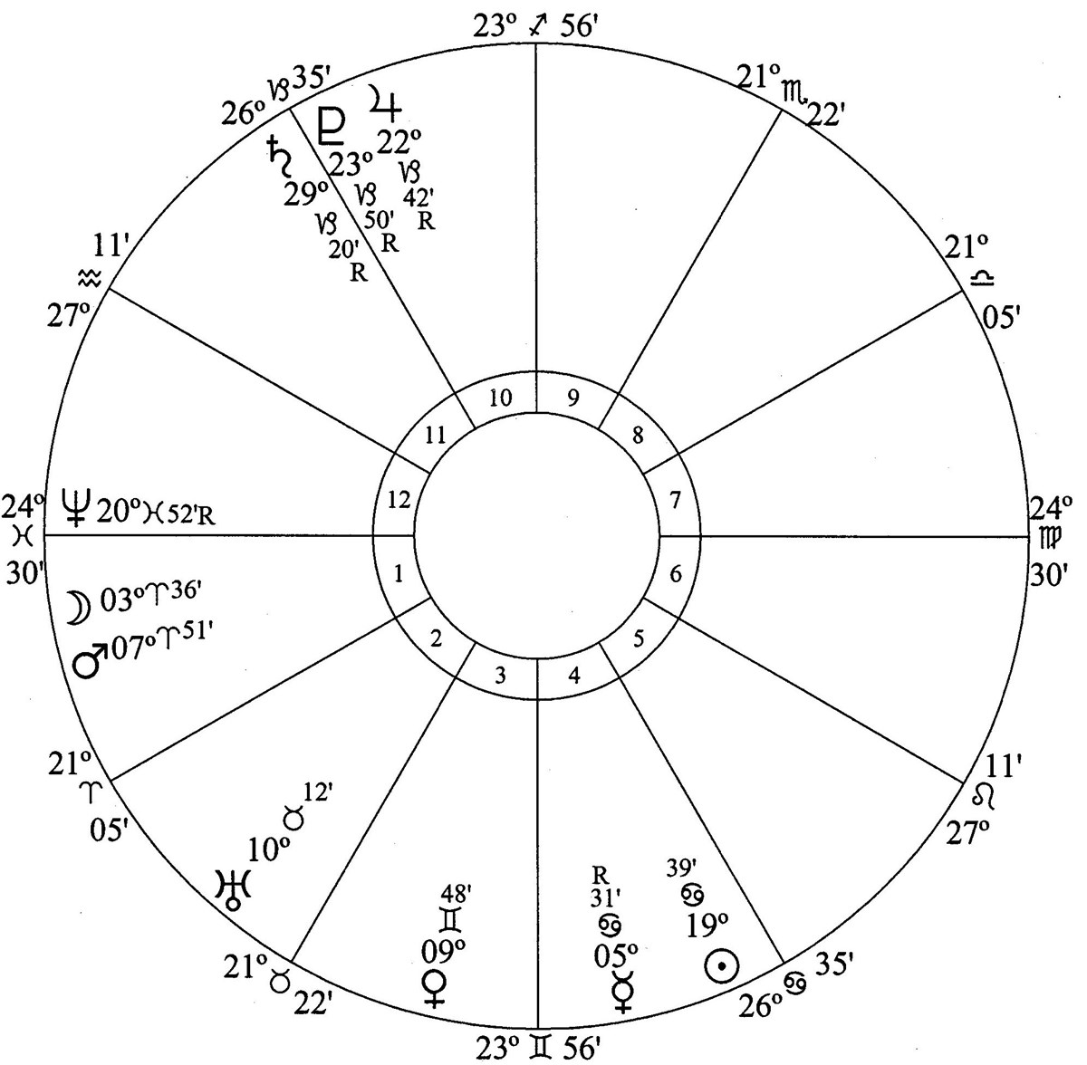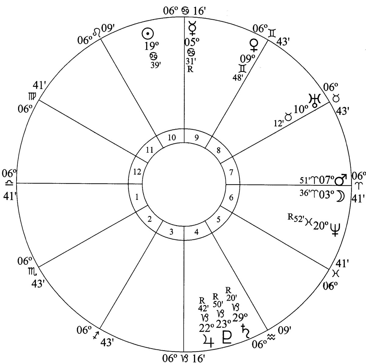 Jupiter, Saturn and Pluto are in house 4 (homes, land and buildings). Houses 4, 9, 10 and 6 have the highest astrodyne counts.